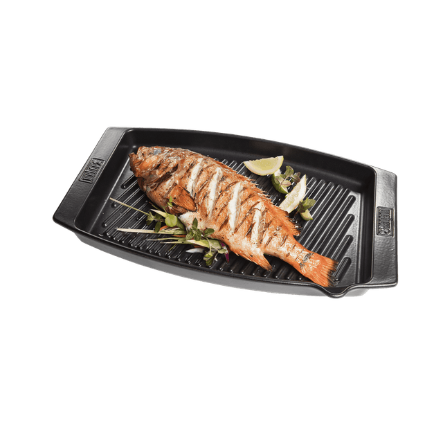 Weber Plat à poisson en céramique, 47 x 28 cm, idéal pour griller et servir des aliments comme le poisson, la viande et les légumes. Grâce à son fond gexturé, la poêle est bien adaptée à a friture et permet une belle marque de grillade. Grâce à sa conception, les sauces et les jus peuvent être facilement vidés. Référence: 17886