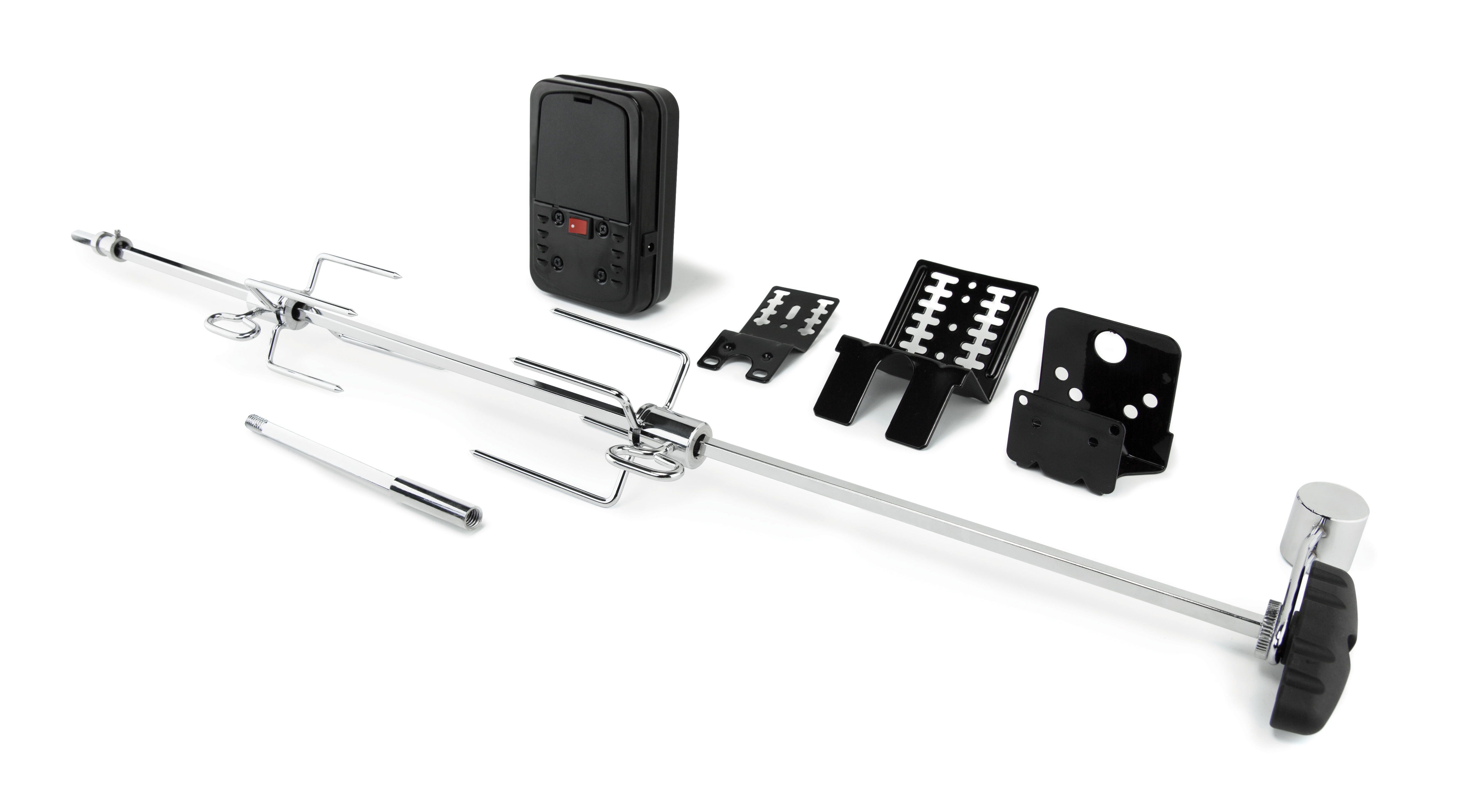 BroilKing Tournebroche universel Kit tournebroche pour barbecues, comprenant un moteur électrique, une tige, un contrepoids, des fourches, un support, des vis et des écrous. – Réf: 60526